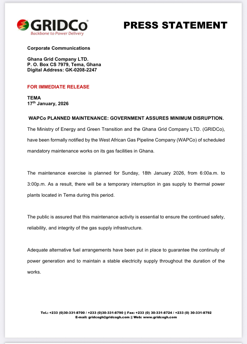 In a statement released on Saturday, January 17, 2026, GRIDCo disclosed that it had received official notification from WAPCo regarding compulsory maintenance works on its gas facilities in Ghana. The exercise is scheduled to take place on Sunday, January 18, 2026, between 6:00 a.m. and 3:00 p.m.