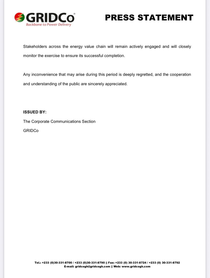 The statement was signed by GRIDCo’s Corporate Communications Section.