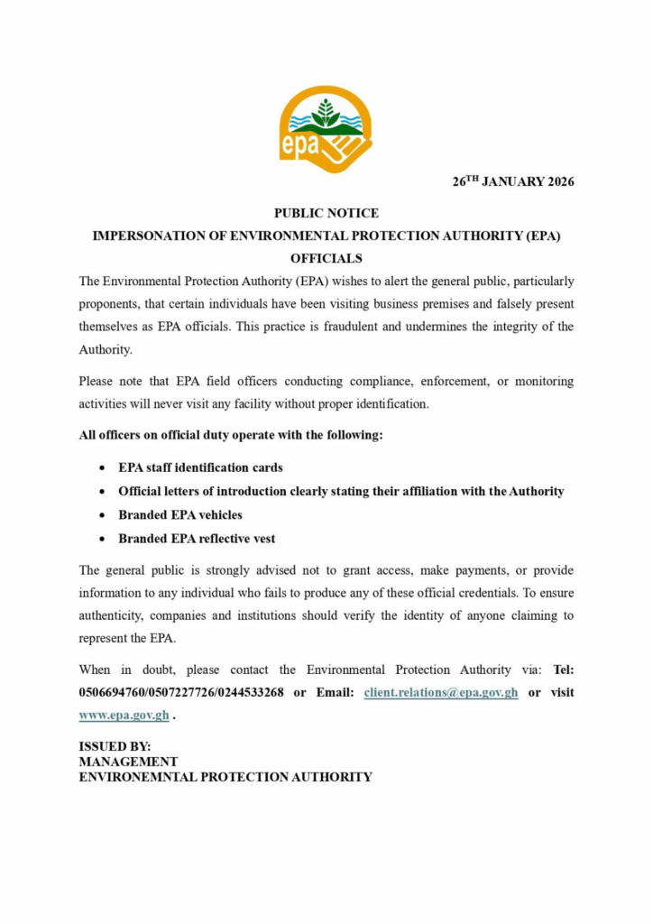 The Environmental Protection Authority (EPA) has cautioned the public against the activities of individuals impersonating its officials and unlawfully visiting business premises under false pretences.