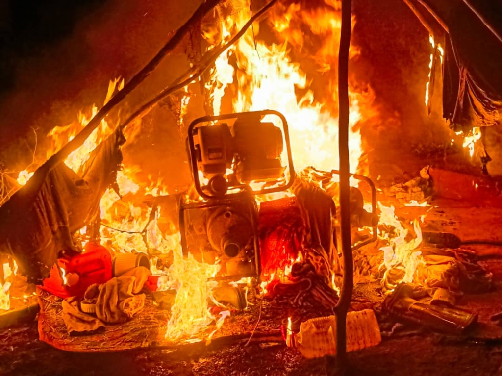 During an operation led by the Western North Regional Forest Services Division last night, authorities destroyed several pieces of mining equipment along with temporary structures that the miners had set up within the protected areas.