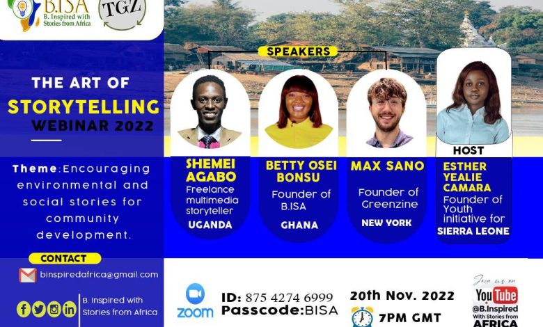“Who better tells a story than the victim?” – B.ISA Founder, Betty Osei Bonsu. As part of efforts to increase awareness on social and environmental storytelling, B. Inspired with Stories from Africa (B.ISA) in collaboration with the GreenZine has organised an event dubbed “ The Art of Storytelling”. The maiden edition featured Shemei Agabo, a Freelance Multimedia storyteller from Uganda, Max Sano, a Lead Editor of Greenzine from New York, Esther Camara founder of Youth Initiative for Climate Action from Sierra Leone and the founder of B.ISA, B. Inspired with Stories from Africa, Betty Osei Bonsu.